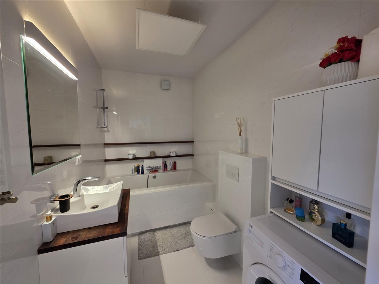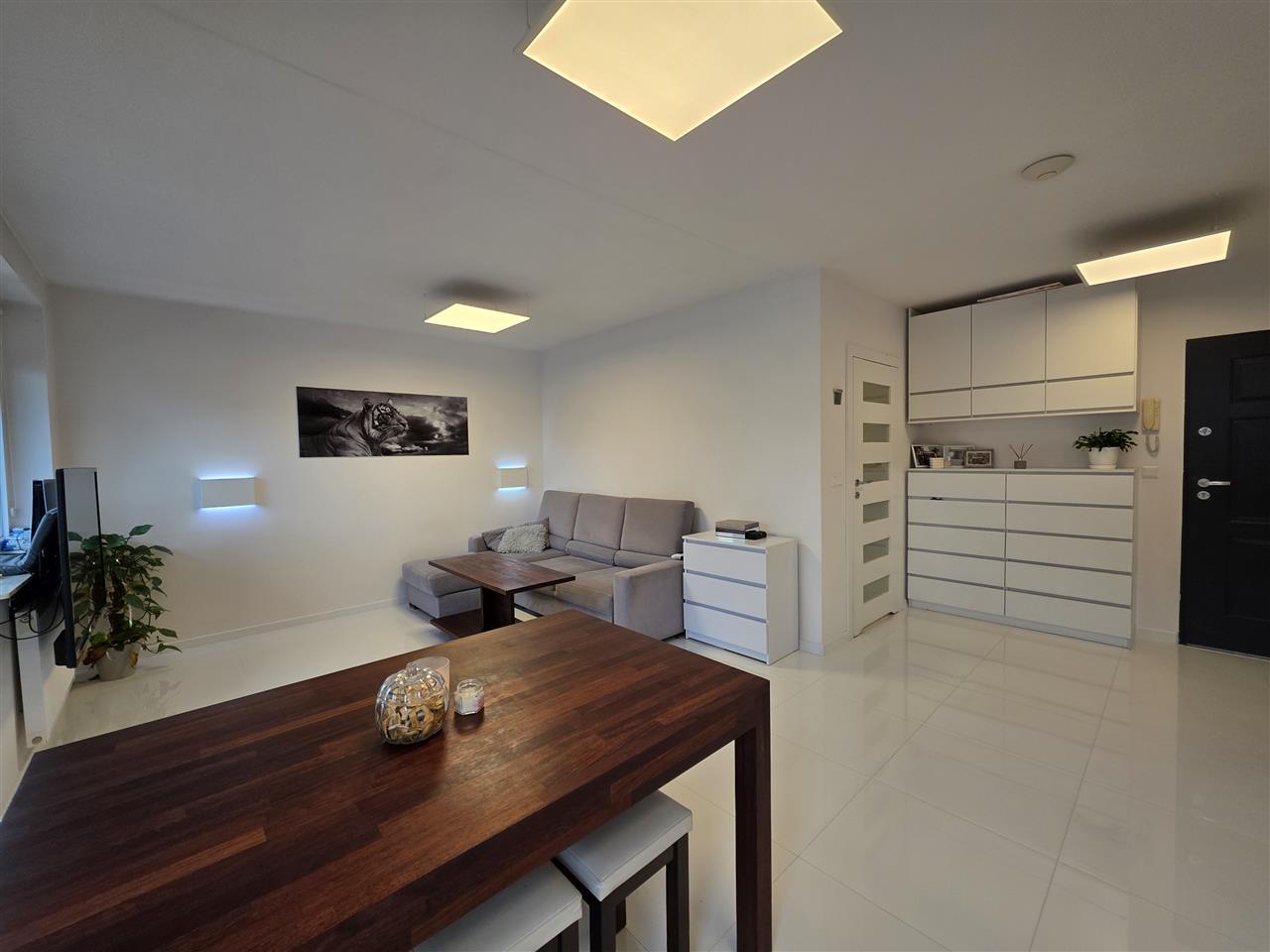 Mieszkanie składa się z przestronnego pokoju z aneksem kuchennym, sypialni oraz łazienki. Salon z wyjściem na balkon. Kuchnia w zabudowie wraz ze sprzętem AGD. Mieszkanie w pełni umeblowane. Sypialnia z szafą z lustrami w zabudowie. W łazience wanna. Na podłodze położona terakota . Oświetlenie ledowe z możliwością sterowania kolorami za pomocą aplikacji w telefonie.