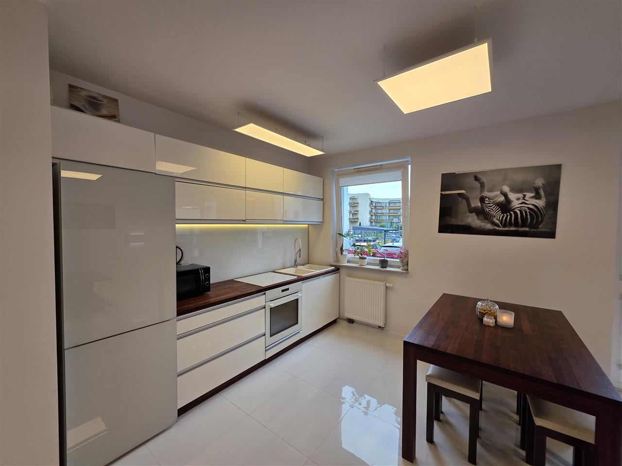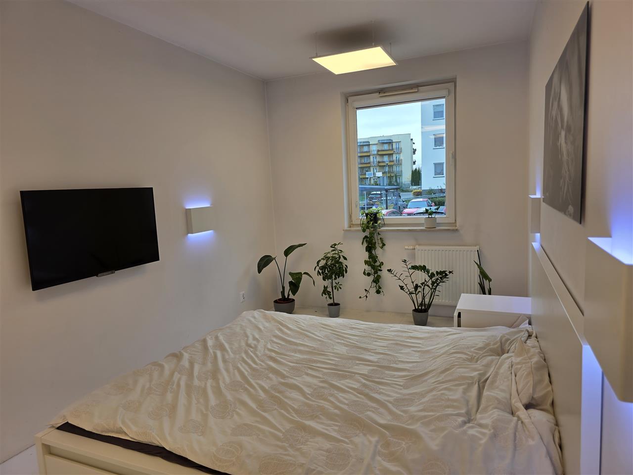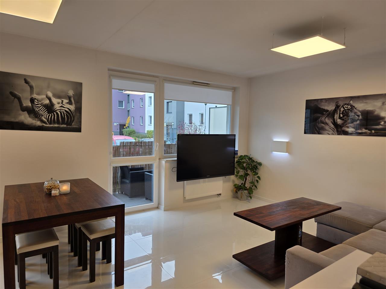 Mieszkanie składa się z przestronnego pokoju z aneksem kuchennym, sypialni oraz łazienki. Salon z wyjściem na balkon. Kuchnia w zabudowie wraz ze sprzętem AGD. Mieszkanie w pełni umeblowane. Sypialnia z szafą z lustrami w zabudowie. W łazience wanna. Na podłodze położona terakota . Oświetlenie ledowe z możliwością sterowania kolorami za pomocą aplikacji w telefonie.