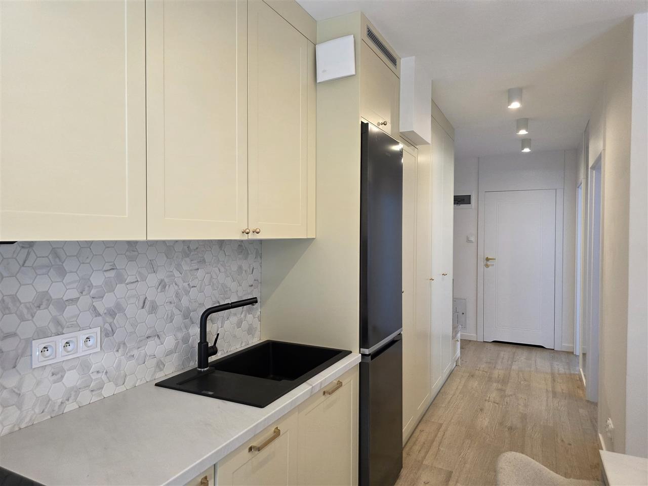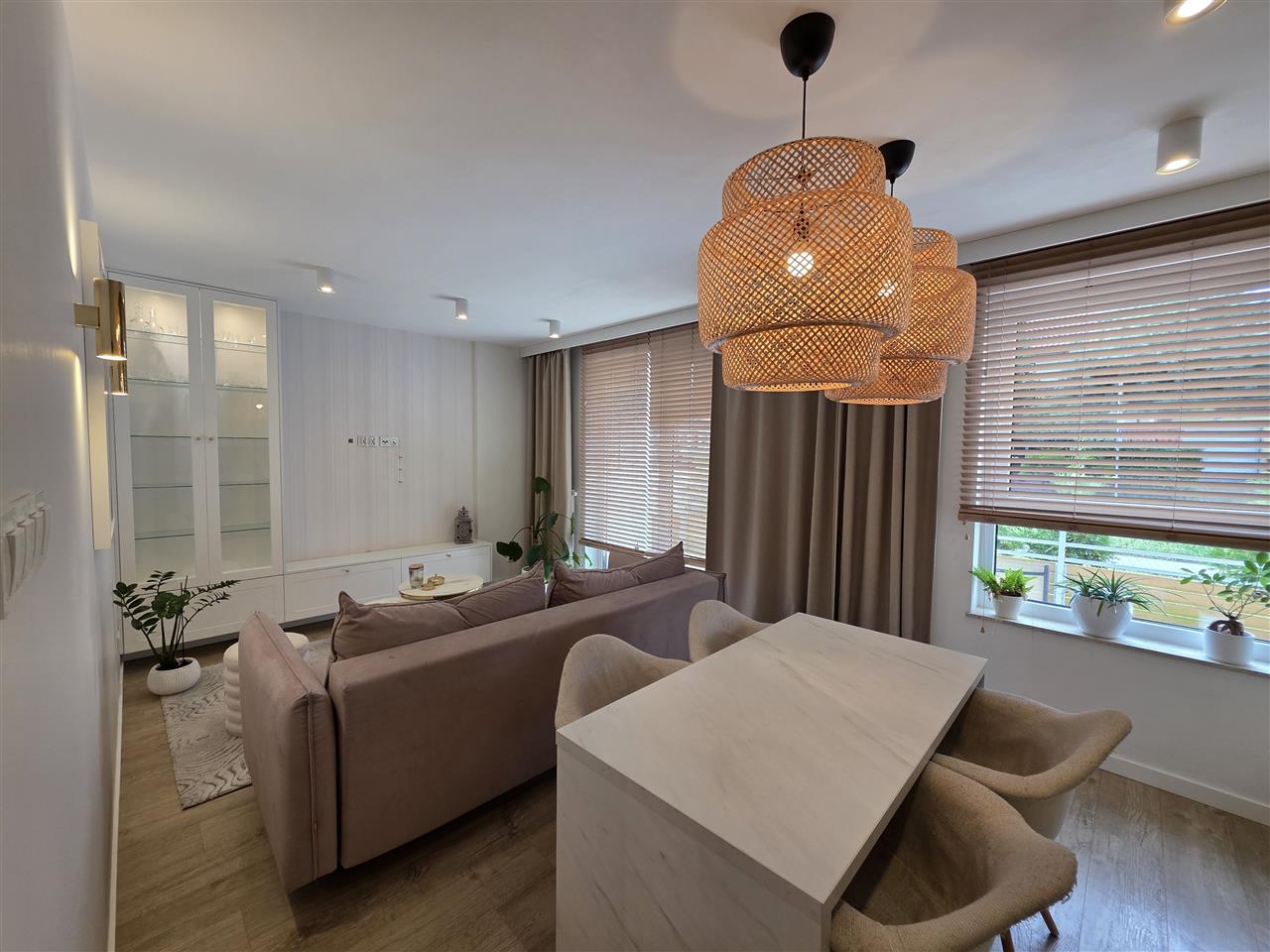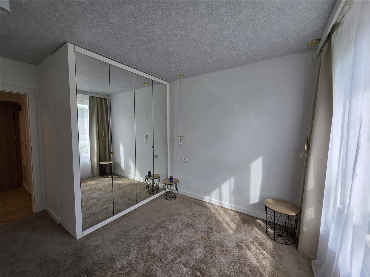 Salon z wyjściem na przestronny taras, połączony z aneksem kuchennym wraz z pełnym umeblowaniem. Kuchnia w zabudowie wraz ze sprzętem AGD (indukcja, piekarnik, okap, zmywarka, lodówka). W sypialni szafa przesuwna z lustrami. Na podłodze w przedpokoju oraz salonie na podłodze panele. Łazienka z kabiną prysznicową typu walk in, pralka.