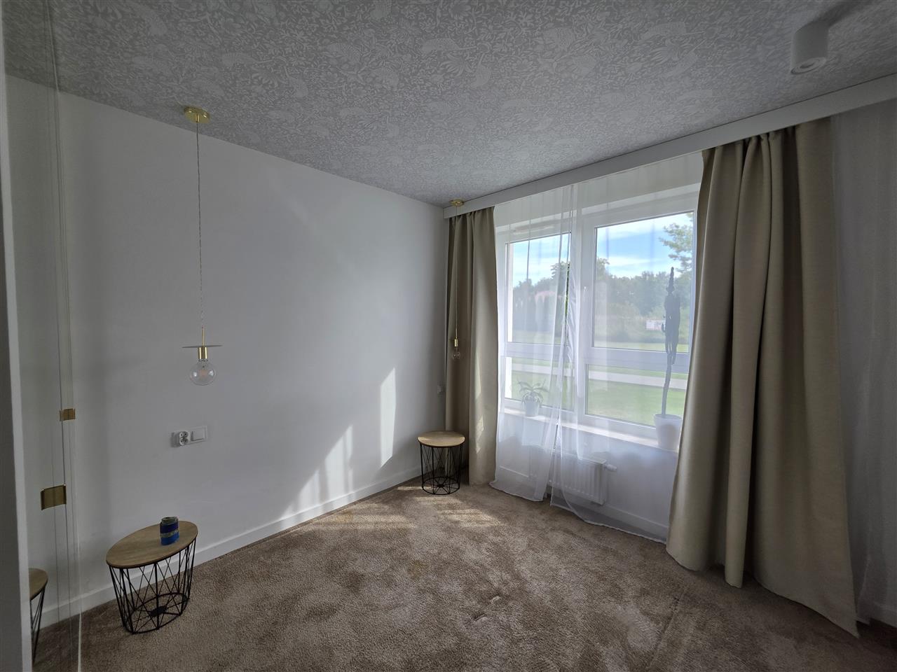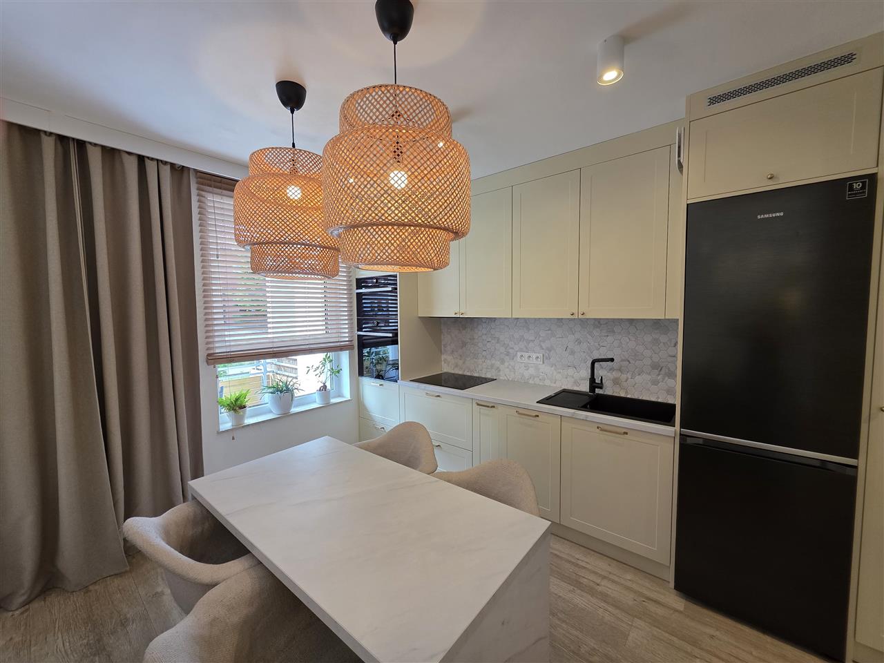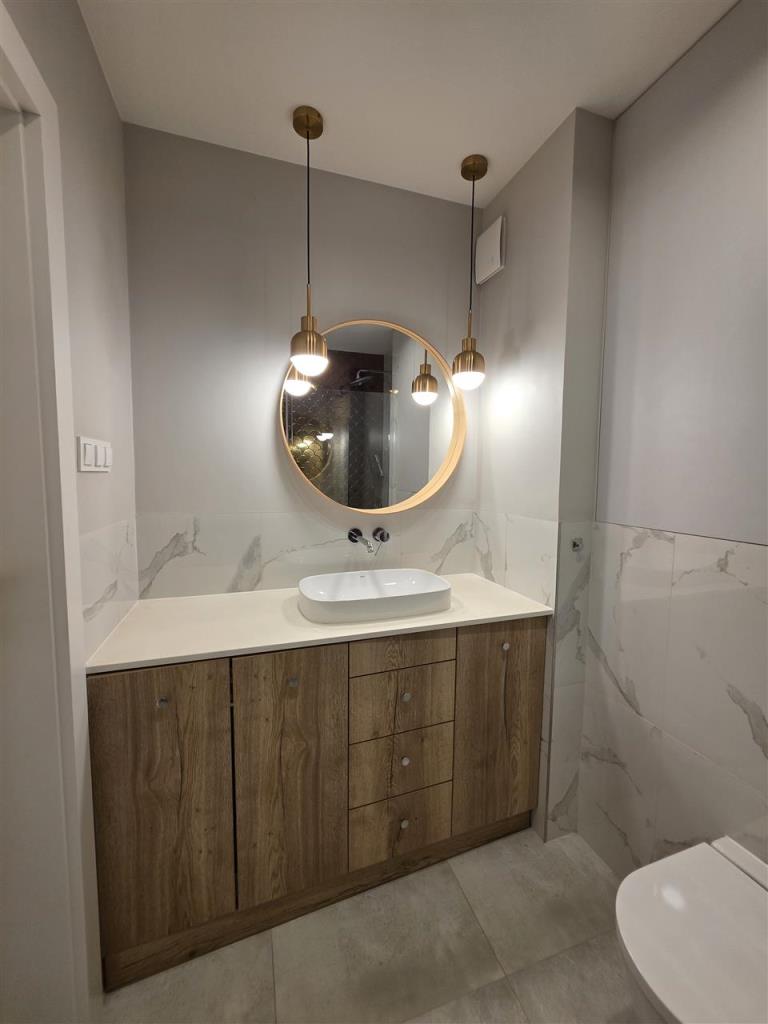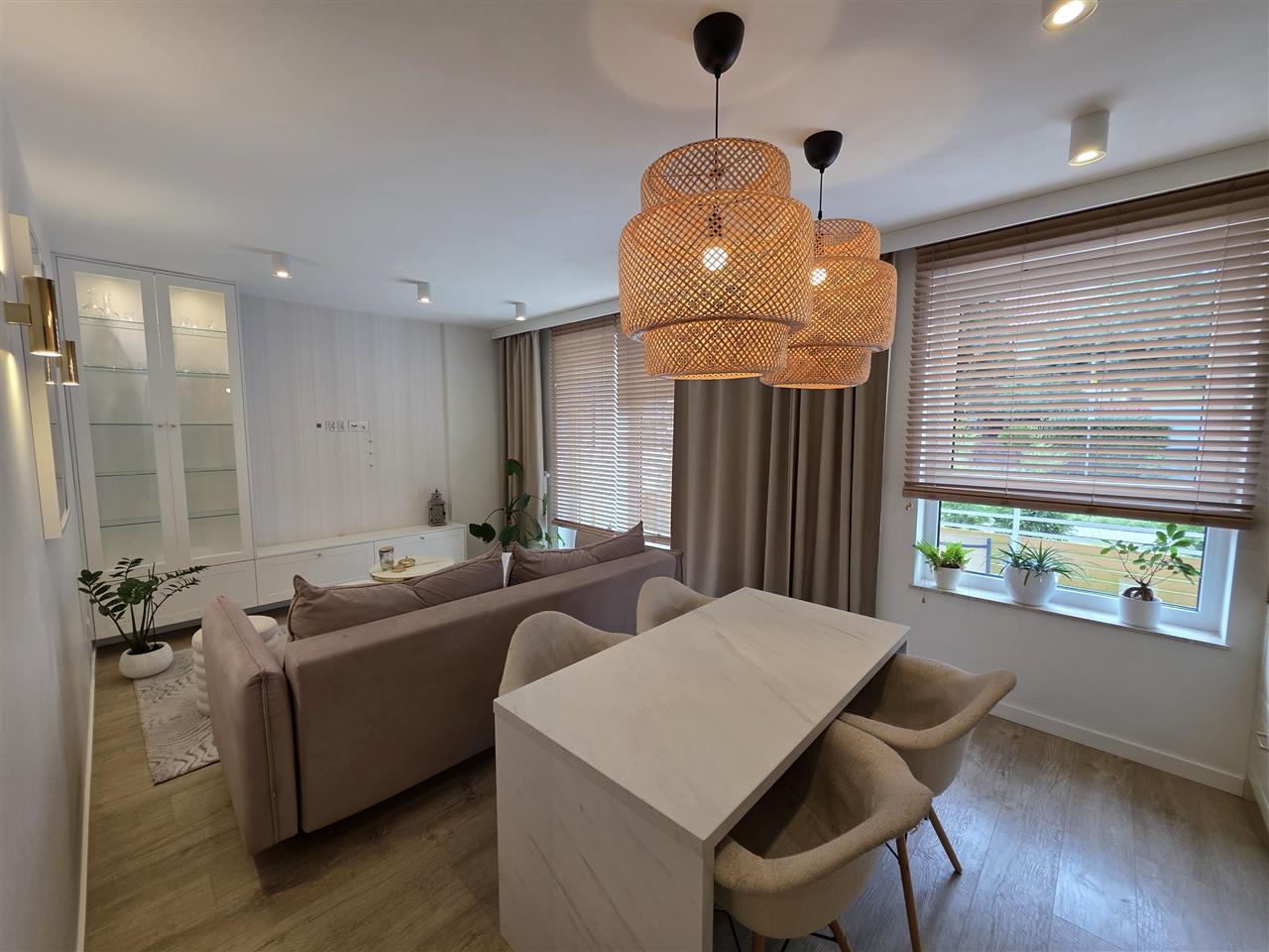 Salon z wyjściem na przestronny taras, połączony z aneksem kuchennym wraz z pełnym umeblowaniem. Kuchnia w zabudowie wraz ze sprzętem AGD (indukcja, piekarnik, okap, zmywarka, lodówka). W sypialni szafa przesuwna z lustrami. Na podłodze w przedpokoju oraz salonie na podłodze panele. Łazienka z kabiną prysznicową typu walk in, pralka.